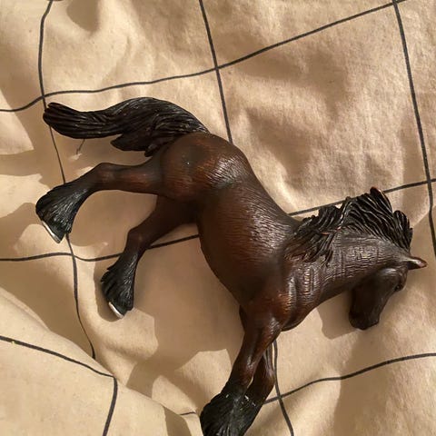 Schleich hevosfiguuri. Muovinen ruskea hevonen, jossa tummempi harja, häntä ja jalat. Soveltuu leikkeihin ja kokoelmiin hevosteemaisista leluista pitävälle lapselle. Koko noin kämmenen kokoinen.