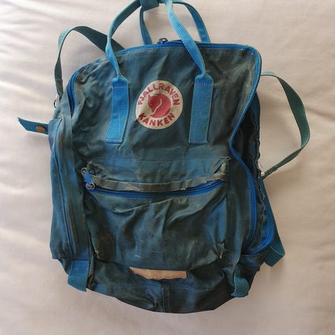 Annetaan uuteen kotiin hyvin palvellut ja korjausta vaativa Fjällräven Kånkenin klassinen (F23510) sinivihreä reppu. Pysyy vielä kasassa, mutta toinen olkahihna on osin irronnut paikoiltaan, ja repun pohja on ohentunut käytössä. Pohjassa on myös muutamia pieniä reikiä, joista suurinta on yritetty ommella umpeen.
