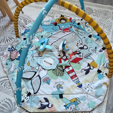 Annetaan viidakkoteemainen Fisher-Price leikkimatto. Siistissä kunnossa, yläosassa olevan papukaijan äänet eivät enää toimi.