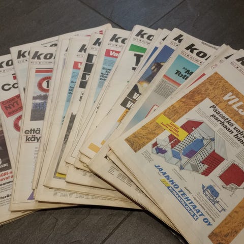 Koneviesti-lehtiä vuodelta 1993. Ovat luetussa kunnossa, mutta ainakin nopeasti vilkaistuna aivan lukukelpoisia edelleen. En siis ole käynyt jokaista lehteä tarkasti läpi. Saattaa olla kynämerkintöjä, repeämiä, niitinirtoamia ja kellastumaa yms. Säilytetty sisätiloissa.