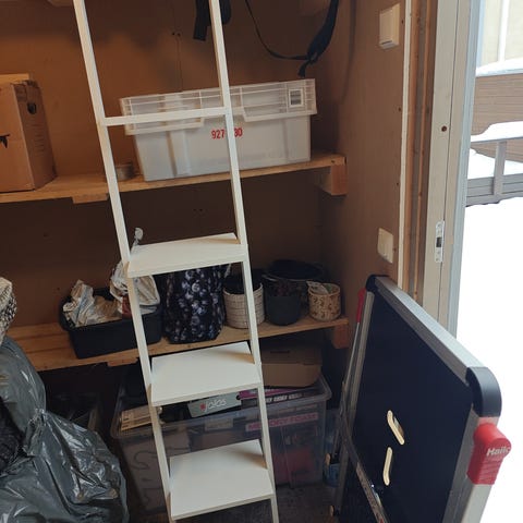 Irrota ja hae pois. On kiinni 2 ruuvilla, joista toinen näkyy kuvassa. Lähi kuvissa näkyy hyllyjen tummentumat ja kulumat. Osa liasta voi lähteä hyvillä puhdistusvälineillä. Hyllyssä on yksi laatikko alaosassa.