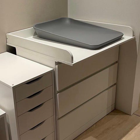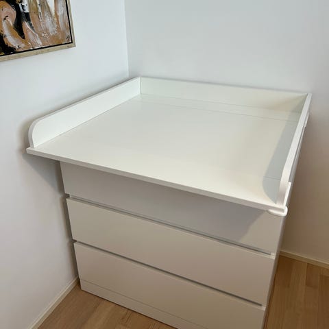Erinomaisessa kunnossa oleva valkoinen hoitotaso, joka asetetaan esim. Ikean Malm-lipaston tai vastaavan pöytätason päälle. Vauvan vaipanvaihtoon tukeva taso.