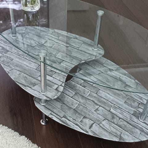 Tyylikäs....ovaali tumma lasi ja metalli runko koristeinen..tyylikäs...kuvassa pöydällä omaa tavaraa joka ei kuulu mukaan...nouto hamina.