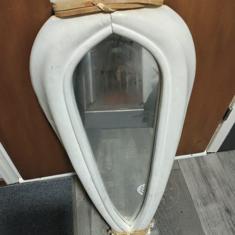 Harmaa kehys, kaareva yläreuna. Peilin koko kehyksineen K 118 cm x L 32 cm. Pyörät alla, joista kaksi lukittavia. Finnmirror.
