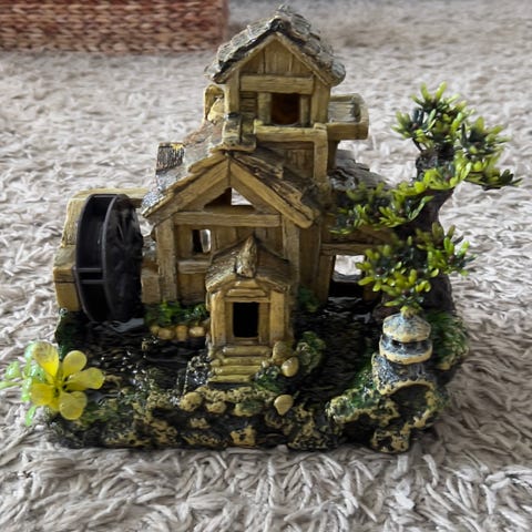 Hyväkuntoinen akvaariokoriste, johon saa yhdistettyä ilmapumpun, jolloin koristeesta tulee kuplia. (Ei sisälly ilmapumppua mukaan)