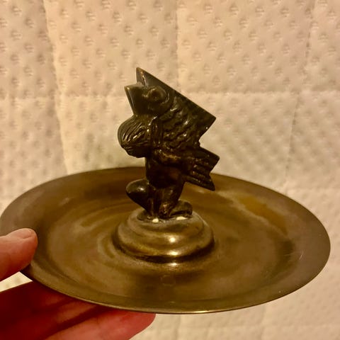 Ajan patinoima, soma käyttö-tai koriste-esine. Korko 2,5cm, kannen halkaisija 7,5cm.