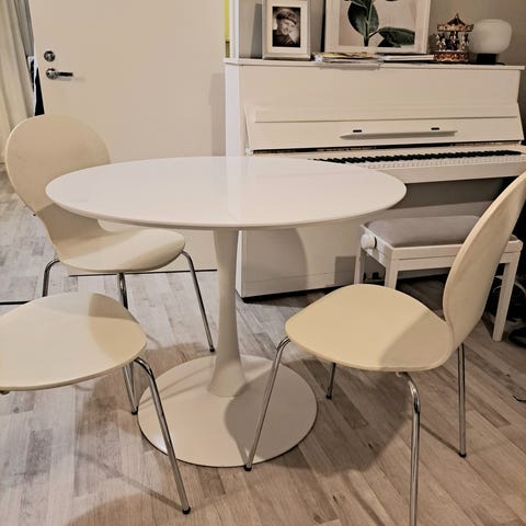 Pyöreä musta pöytä, joka ostettu Maskusta pari vuotta sitten. Pöydän halkaisija on 100 cm ja siinä on trumpettijalka. Pöytä on hyvässä kunnossa.