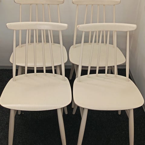4 vanhaa pinnatuolia. Ok kuntoisia, osa hieman nitkuu ja joitakin on taidettu joskus ruuvaillakkin. Kestää kuitenkin käyttöä ja pikkuviat on varmasti korjailtavissa. Lakattu mustaksi. Nouto Lievestuoreelta.