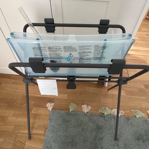Taitettava vauvan kylpyamme telineellä. Ostettuna käytettynä ja oli meillä käytössä 5kk. Musta edelleen hyväkuntoinen, en löytänyt vikoja.