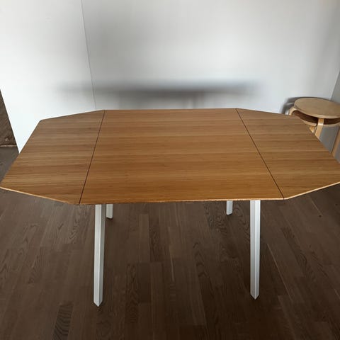 Ikean tammiviiluinen Bjursta ruokapöytä. 90x90cm ja jatkettuna 168,5cm. Kulumaa löytyy kuten kuvista näkyy. Liinan kanssa toimiva peli edelleen tai ilmankin jos ei kulumat niin haittaa. Osaava korjaa siistimmäksikin. Jatkopalat pöytälevyn alla ja helppo vetää päistä, nämä siistimmässä kunnossa.