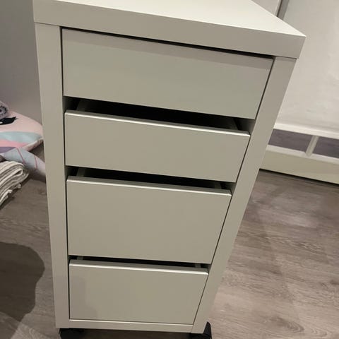 Myydään IKEA micke laatikosto valkoinen. Nelilaatikkoinen säilytyskaluste pyörillä, soveltuu esimerkiksi työpöydän / meikkipöydän viereen tai yleiseen säilytykseen kotona tai toimistossa.