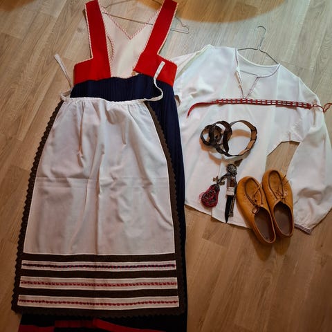 Kaunis Pyhäjärven pienen tytön kansallispuku. Mekko, paita ja esiliina. Sopii ehkä 1-3 vuotiaalle. Annan tarkempia mittoja tarvittaessa.