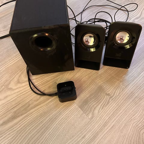 Myynnissä hyvin toimiva Logitechin 2.1 kaiutinjärjestelmä. Saa yhdistetty 3,5mm audiokaapelilla tietokoneeseen, kännykkän, telkkariin tai muihin laitteisiin. Mitään vikoja ei esiintynyt, pieniä naarmuja saattaa olla pinnassa. Huipputeho: 50 W , Taajuusvaste: 48 Hz – 20 kHz (+/- 3 dB).