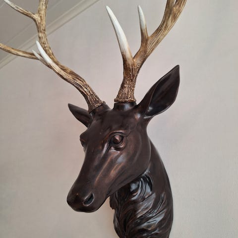 Hirvenpää sarvilla. Luonnonvärinen, kuivattu ja puhdistettu hirvenpää, jossa on täysi sarvisto. Sopii esimerkiksi metsästysaiheiseen sisustukseen tai kokoelmaan seinälle ripustettavaksi. Koko ja tarkka ikä eivät käy ilmi kuvista, mutta kyseessä on aito hirvenpää sarvineen.