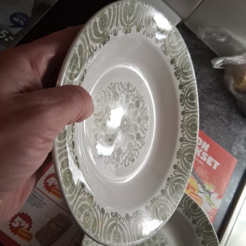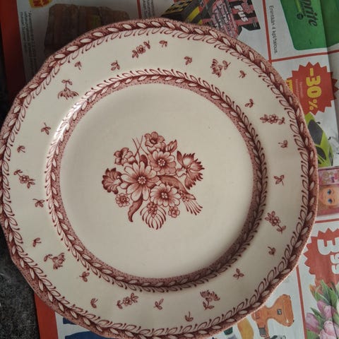 Arabia lautanen, valkoinen pohja ja punaiset pilkut reunalla. Lautasen halkaisija on noin 26 cm ja reuna on loivasti syvenevä, sopii esimerkiksi ruokalautaseksi tai pastalautaseksi. Materiaalina lasitettu keramiikka/posliini. Pohjassa Arabia-leima, valmistettu Suomessa.