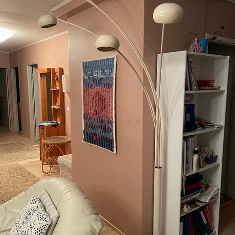 Siromuotoinen kaarivalaisin, jossa on messinkinvärinen metallivarsi ja pallonmuotoinen varjostin. Valaisimessa on tukeva musta pyöreä jalusta ja sen teleskooppivarsi mahdollistaa korkeuden säädön.Valaisimessa on säädettävä varsi ja heijastinpinnalla varustettu pallovarjostin. Messinkipinnoissa on nähtävissä pientä ajan tuomaa patinaa ja kulumaa.Väri: messinki, mustaMateriaali: metalliMitat: Korkeus: n. 140-180 cm Leveys: n. 64 cmTuote on tarkistettu