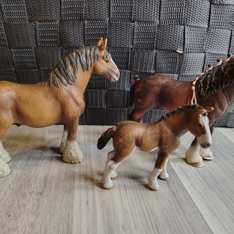 Myydään leikeissä olleita Schleich hevosia. Valkoisella varsalla sarvi katkennut ja osassa hepoissa leikin jälkiä, muuten ehjiä.