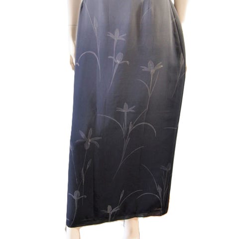 Naisten pitkä hame koossa XL. Väri tummanruskea, kankaassa läpikuultava pinta ja kukkakuviointi. Materiaali polyesteriä. Helmassa koristeelliset vaakasuorat raidat. Hameessa on alushame ja päällä läpikuultava kerros. Takana vetoketju ja vyötäröllä vyölenkkejä. Soveltuu arki- ja juhlakäyttöön.