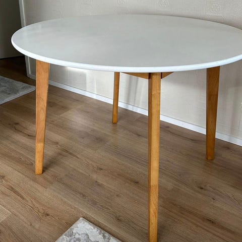 Hakusanat: puujalat, Paketoitava, Valmistaja, pyöreä pöytä, valkoinen pöytä, pöytä, käytetyt huonekalut, pöydät, 110cm, ruokapöytä, keittiö, keittiöpöytä, ruoka, ruokailu, taso, keittiön, huonekalu, huonekalut