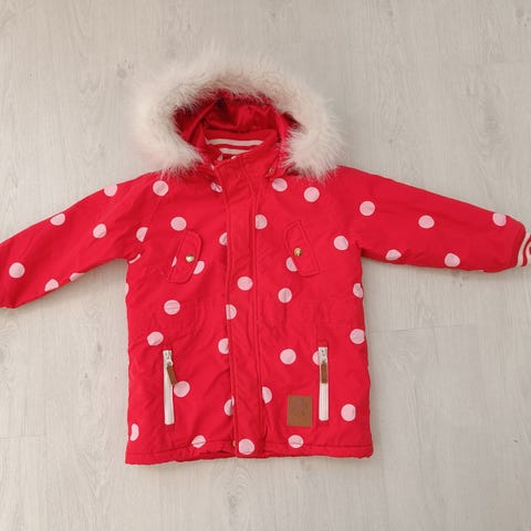 Mini Rodinin talvitakki koko 116/122. Takki hyvässä kunnossa. Toisessa etutaskussa ja sisävuoressa käytönjälkiä (kts kuvat), mutta eivät näy käytössä.