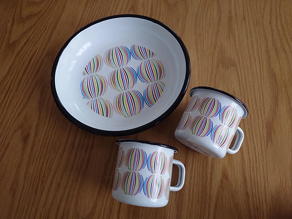 Design Raija Uosikkinen, 1970-luku. Kermakko ja sokerikko, joissa on punainen koriste.