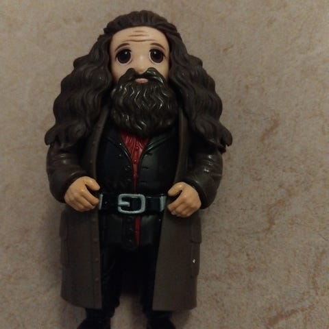 Muovinen hahmofiguuri, jossa on oranssi, pyöreä pää, pitkä vaalea nokka, ruskea yläosa, vaaleansiniset housut ja ruskeat kengät. Hahmolla on vihreä huivi tai viitta selässä. Sopii leikkeihin tai kokoelmaan. Korkeus arviolta muutamia senttimetrejä.