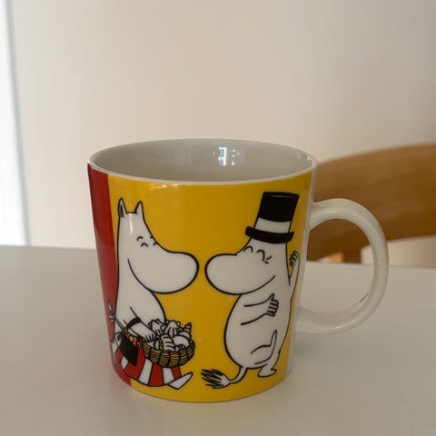 Kuvan muumimuki, vanhaa tuotantoa, lasitus mielestäni hieman kulunut ( musta levinnyt?). Perusilme kuitenkin siisti ja muki kaikin puolin ehjä.