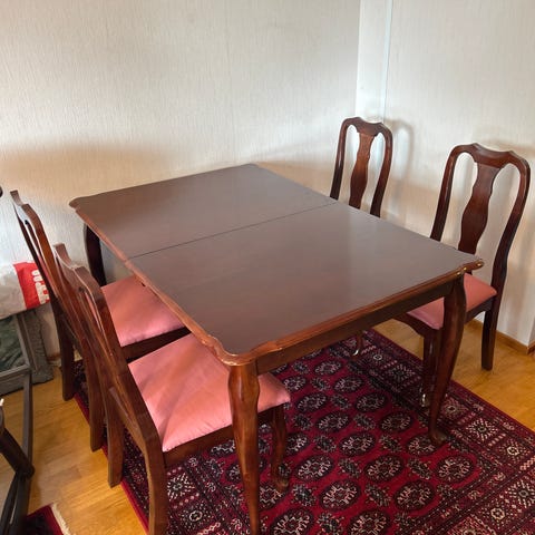 Pieniä käytön jälkiä, mutta toimiva kokonaisuus. 6 tuolia, tuolit vankat ja kankaat puhtaat.