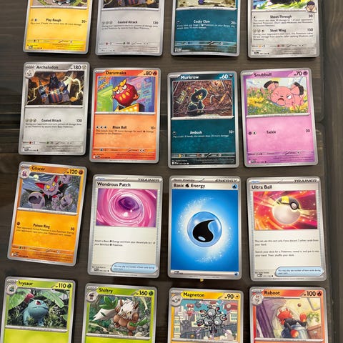 Pokémon keräilykortit sekapaketti. Kuvassa näkyy useita erilaisia Pokémon-kortteja, mukana sekä perus- että erikoiskortteja. Kortit soveltuvat keräilyyn ja pelaamiseen Pokémon Trading Card Game -pelissä. Paketin tarkka korttimäärä ja yksittäiset kortit ilmenevät kuvasta.