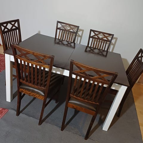 Hyvässä kunnossa oleva ruokapöytä ja neljä tuolia. Pöydän halkaisija 110 cm, korkeus 73 cm. Pöytä ja tuolit ovat tukevat.
