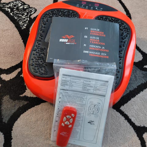 Vibrolegs jalkahierontalaite kotikäyttöön. Sähkötoiminen laite, jossa on kaksi jalka-aukkoa ja hierontapinnat jalkapohjille. Päällä ohjauspaneeli painikkeilla eri toiminnoille ja asetuksille. Oranssi runko ja mustat jalkatukiosat. Soveltuu jalkojen rentouttavaan hierontaan ja verenkierron parantamiseen.