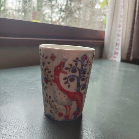 Iittala Taika muki, jossa värikäs koristekuviointi ja eläinaiheinen kuvitus. Valkoiselle pohjalle painettu monivärinen kuvio kiertää koko mukin. Muki sopii kuumille juomille, kuten kahville ja teelle. Materiaalina on kestävä posliini/keramiikka, ja mukissa on yksi korva helpottamassa käsittelyä arjessa.