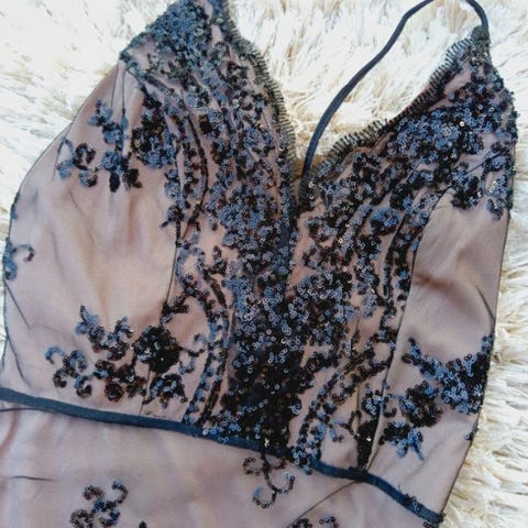 juhla- tai cocktailmekko, koko XL. Musta mekko, jossa kullanvärinen tähtikuviointi kauttaaltaan. Valmistusmateriaali polyesteriä. Mekossa on V-pääntie, vajaamittaiset hihat röyhelöillä sekä väljä, laskeutuva helma. Sopii juhla- ja iltatilaisuuksiin. Joustavaa kangasta.