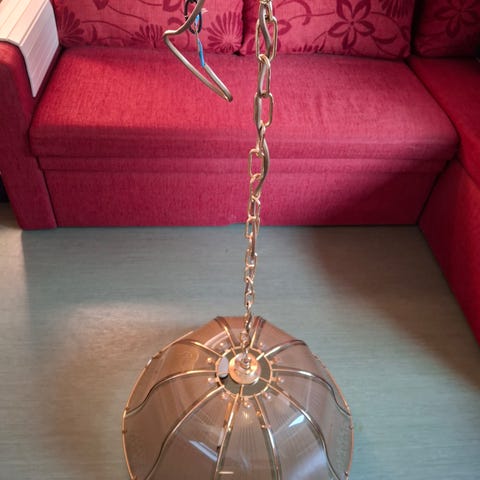 Maitolasinen valaisimen kupu. Kaulusosan sisähalkaisija n. 13,3 cm ja ulkohalkaisija n. 14,9 cm. Kuvun max. halkaisija n. 19,7 cm. Kupuosan korkeus n. 7,5 cm ja kokonaiskorkeus n. 9 cm.
