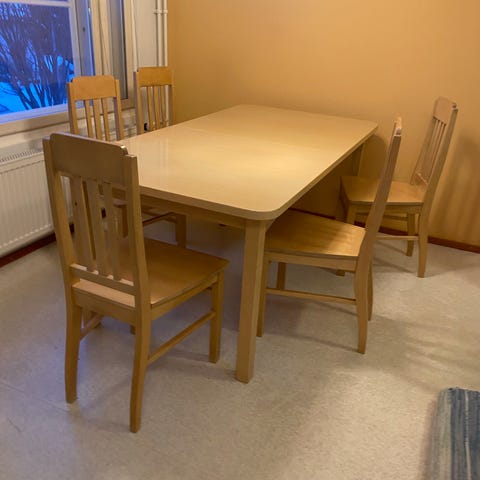 Periaatteessa toimiva ja melko tukeva, irroitettavilla metallijaloilla. Pöydän kannessa jälkiä, esim vahakankaalla saa paremman näköiseksi ja joku taitava ehkä osaa tarvittaessa kunnostaa. Pyöristetyt kulmat eli esimerkiksi lapsiperheessä kätevä. Mielellään nopea nouto!