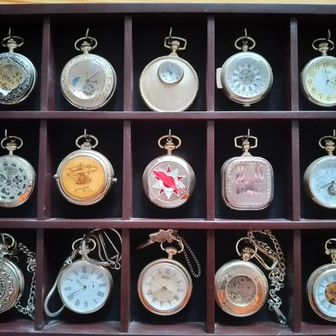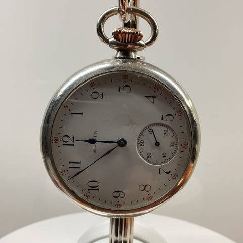 Wanha taskukello juna kuvioinnilla. Pieni naarmu lasissa. Vedettävä, toimii. Incabloc, miljönär 17 rubis.