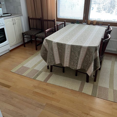 Valkoinen jatkettava ruokapöytä kahdella jatkopalalla. Jatkettuna suurikin seurue mahtuu pöydän ääreen, jatkamattomanakin 6-8 ruokailijaa. Kuvissa ei jatkopaloja asetettuna. Ikean Bjursta, jo poistunut malli. Pöytä on jämäkkä. Ikää pöydällä jo on ja lapsiperhe-elämästä kulumaa tullut hieman reunoihin. Korkeus: 74 cm, pituus: 175 cm, leveys: 95, jatkopala 43 cm x2.