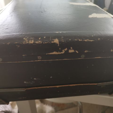 Hauska ruotsalaisvalmisteinen pikkulaukku suunnilleen 100 vuoden takaa. Kovapintainen, materiaali vaikuttaa ohuelta pelliltä, mutta voi olla jotain muutakin. Salvat ja kahva kunnossa, siisti ja tuoksuton, mutta aikoinaan paljonkin käytetty - käyttökulumaa siis löytyy, mutta ei korjattavaa tai siivottavaa. Leveys 41 cm, korkeus 24 cm, paksuus 11 cm.