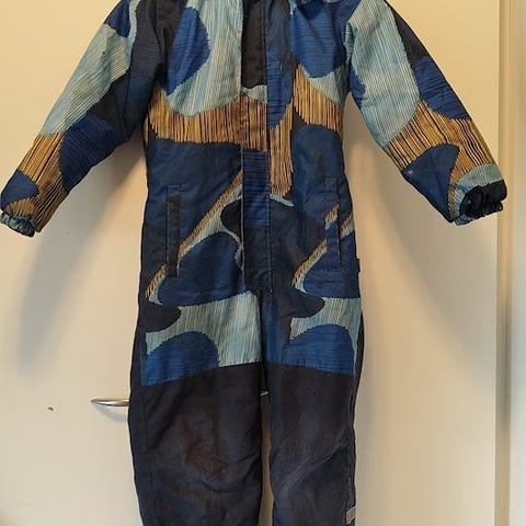 Ehjä, yhden talven pidetty haalari hupulla. Polvissa ja takapuolessa vähän kulumaa mutta ehjä ja vedenpitävä yhä. Vetoketjut ehjät.