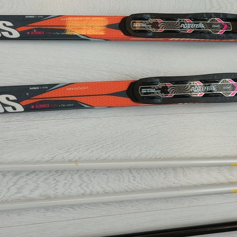 Hyvät pitopohjasukset alakouluikäiselle. Suksien pituus 150 cm, sauvat 110cm.