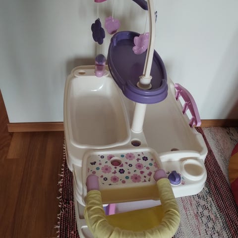 Annetaan käytetyt Brio-merkkiset nuken vaunut. Kopan tuki on irronnut toiselta puolelta, eli koppa ei pysy kunnolla paikallaan. Alakorin kankaassa reikä. Mukaan patja, tyyny, peitto, sadesuoja.