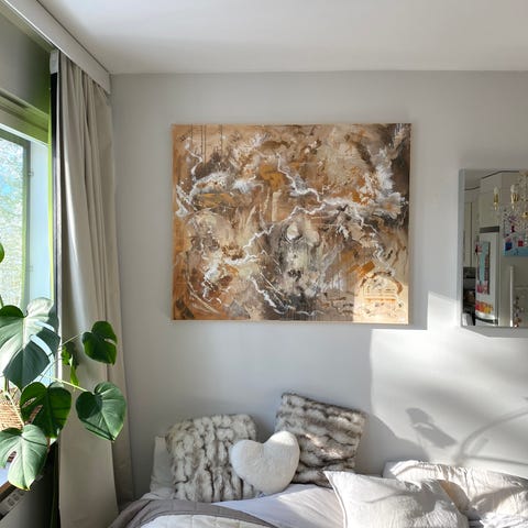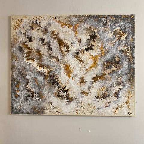 Koko 80 x 100 x 2cm. Maalattu kanvakselle akryylimaaleilla. Laadukas teos, ripustusvalmis ja signeerattu. Takana kiinnike, helppo ripustaa. Teoksessa on paljon yksityiskohtia ja kerroksia, vahva tekstuuri ja eläväinen pinta. Kultaiset yksityiskohdat. Käytetty korkealaatuisia materiaaleja. Teos on vielä paremman näköinen livenä. Teen myös tilaustöitä. Tilaustöiden hinnat menee koon mukaan ja ovat yleensä + 20-40e lisää täällä listattuihin hintoihin verrattuna, eri tyyleillä hieman eri hinta. Kysy lisää. Lisää erilaisia teoksiani myynnissä täällä ja esillä myös instagramissa tilillä heidiabstractart. Kannattaa ottaa tili seurantaan, uusia teoksia valmistuu jatkuvasti. Postitus sopii myös matkahuollon taulukuljetuksena (35,90e). Lisäkuvia/videota saa pyytämällä tai poikkea katsomaan.