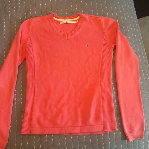 Vähän käytetty virheetön puuvillaneule. Raidat tummansinisiä, vetoketjutasku edessä.