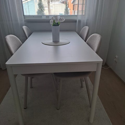 IKEA valkoinen, maalattu, täyspuuta (painava) pitkä ja näyttävä ruokapöytä, jota voidaan käyttää ruokapöytänä tai vaikka työpöytänä. Pöytä on valkoinen ja siinä on neljä jalkaa. Pöydän mitat näkyvät piirroskuvassa (pituus, leveys ja korkeus), ja se sopii usealle istujalle tai useamman työpisteen käyttöön. Ollut toimistokäytössä muutaman kuukauden. Nouto ja omatoiminen purku Helsinki, Malmi. Kunto kuin uusi.