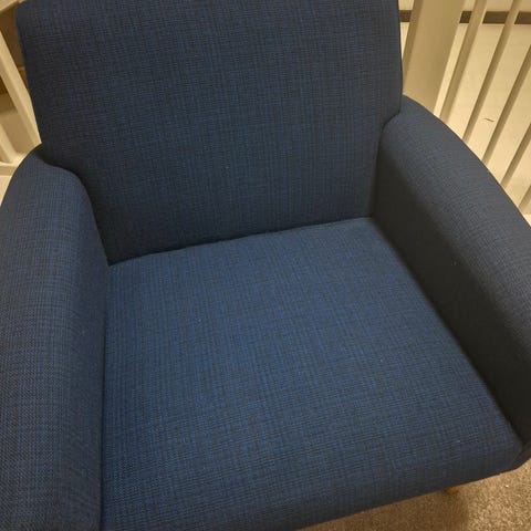 1950-luvulta, verhoiltu uudelleen noin 2010 sinisellä samettikankaalla, puuosat lakattu. Todella vähän istuttu sen jälkeen tässä tuolissa ja verhoilun päällä ollut toinen kangas.