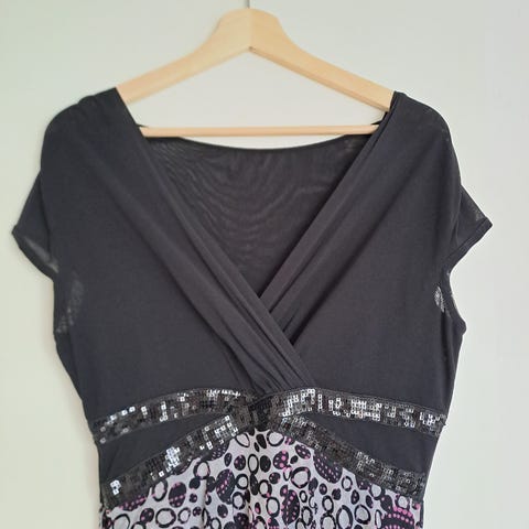 Yläosastaan helmin kirjailtu ohut kaksikerroksinen pitkä mekko.