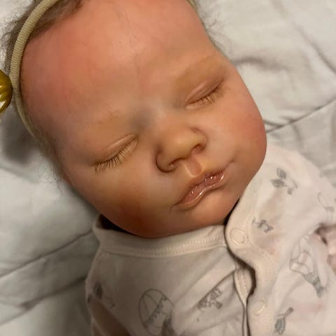 Reborn nukke Bonnie by Linda Murray, pituus 78cm ja paino n. 4kg. Maalattu ilmakuivuvilla maaleilla. Raajat painotettu+peppu, hieno lasihiekka ja vanua. Ripset ja kulmat mohairia, hiuket aitoa hiusta, Jenna Salaman käsialaa. Nuken tekijä ei muuten tiedossa, on jo vanhempi aihio. Niskassa merkinnät. Hinta 400€ sisältää postituksen, tai nouto Pirkkalasta.