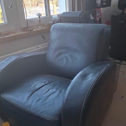 Nahkainen nojatuoli mustalla verhoilulla. Tuolissa on pehmustettu istuin, käsinojat ja selkänoja, jossa on napitettu viimeistely. Täysin ehjät, mutta siis retroa ja ehkä johonkin autotalliin tai hrrastetilaam sopivat