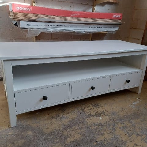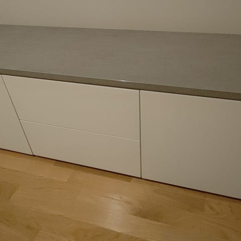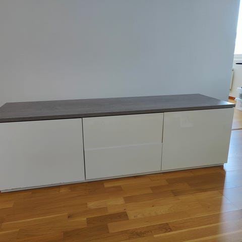 Tv-taso, jossa valkoiset ovet ja harmaa runko. Päällä marmori DC-fix muovi. Toiselle puolelle tehty reiät takaseinään johtoja varten.