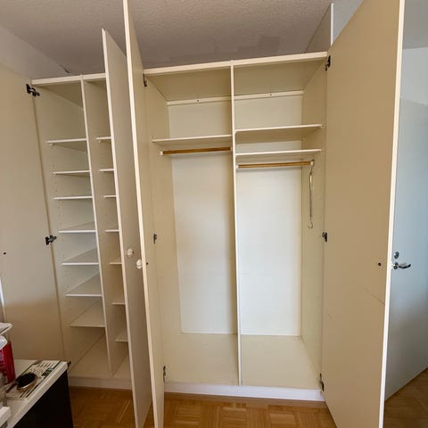 Annetaan ilmaiseksi suhteellisen hyväkuntoinen vaatekaappi. Vaatekaappi on purettu kolmeen osaan. Ovet, hyllyt ja sokkeli on irroitettu. Vain nouto.